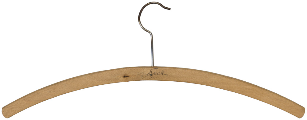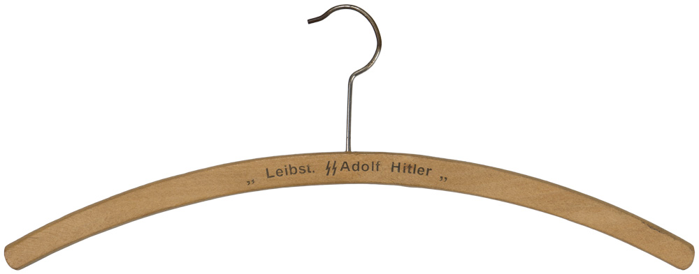 PHYSICAL DESCRIPTION: A 42cm long, x 11cm tall lathed natural softwood clothes hanger with steel fittings. The hanger features a downwardly curved, horizontal, wooden, main hanging arm with a central, vertically extended steel wire hanging hook to the top edge. One side of the top arm has impressed blackened script, "Leibs. SS Adolf Hitler”.