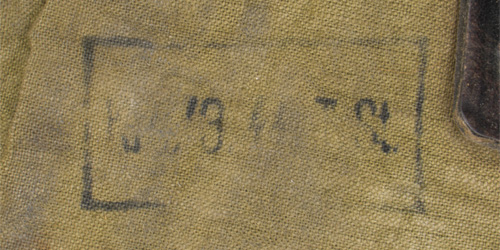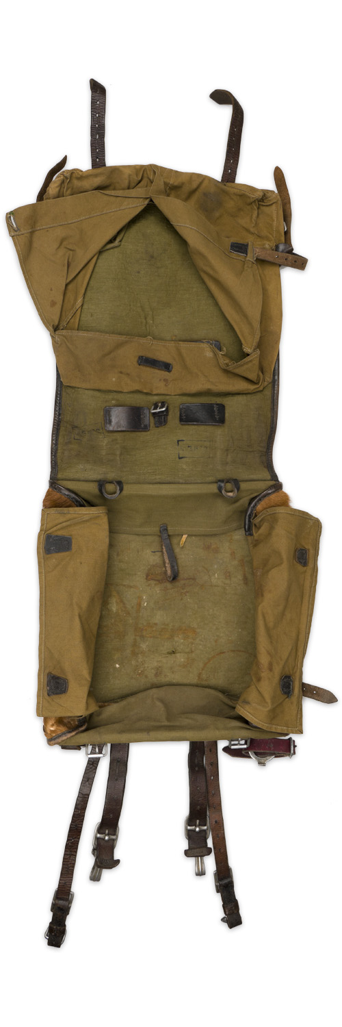 PHYSICAL DESCRIPTION: An olive drab, fur covered, canvas pack with leather and canvas fittings, roughly 31cm wide, 40cm tall and 5cm deep, with a fold-over flap that covers its entire front. Straps, buckles and buttons look to be complete. One of the leather equipment tabs is torn on the back of the pack, but complete. Nice SS marking to the back of the pack. Sows the expected age and use.