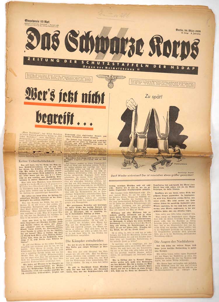 (Zeitung)BACKGROUND: First introduced on March 6TH 1935, "Das Schwarze Korps", (The Black Corps), was the official weekly newspaper of the SS published by the Reichsführung-SS, (High Command of the SS), under direction SS-Obergruppenführer Max Amann and editor SS-Standartenführer Gunter d’Alquen. The paper was printed by the NSDAP’s, Nationalsozialistische Deutsche Arbeiterpartei, (National Socialist German Worker’s Party) own, "Verlag Franz Eher Nachfolger", publishing house in Munich with the editorial office in Berlin and continued in circulation until almost the end of the war as the only uncensored newspaper in Germany. In 1940 the Waffen-SS, (Armed-SS), following the German army’s lead, fielded a SS-Kriegsberichter Kompanie, (War Correspondents Company), to record the exploits of the Waffen-SS in the field. In 1941 the war correspondents company was expanded to battalion strength and further expansion in 1943 increased the war correspondents battalion to regimental strength. The reports and photographs of the Waffen-SS war correspondents were prominently featured in Das Schwarze Korps. Of Note: In 1940 SS-Standartenführer Gunter d’Alquen took over command of the newly forming war correspondents company and the editorial direction of Das Schwarze Korps was passed to Kurt Eggers until his death in August 1943.