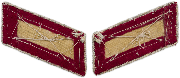 PHYSICAL DESCRIPTION: Machine woven collar tabs with a wine red rayon base with machine woven litzen in bright, silver/aluminum flat-wire threads. The carmine base shows through as the branch of service and center stripes and the collar tabs are trimmed in fine, bright, twisted, silver/aluminum cording.