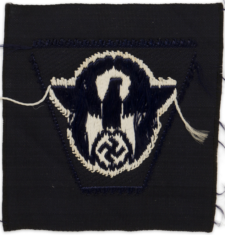 PHYSICAL DESCRIPTION: The insignia consists of a machine woven black rayon base featuring a machine woven, second pattern, (Circa June 1936-May 1945), right facing, police cap eagle with out-stretched wings, clutching a wreathed, canted swastika in it’s talons, encompassed by a vertically oval, oak-leaf wreath all in silver/white rayon threads.