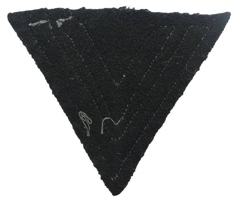 PHYSICAL DESCRIPTION: The insignia consists of dual, bright silver/aluminum diamond patterned tress chevrons, machine sewn to an inverted black wool triangular base. Removed from a uniform.
