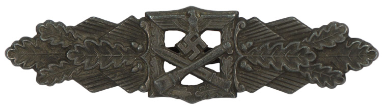 (Nahkampfspange in Bronze)BACKGROUND: The Close Combat Clasp series of awards were introduced on November 25TH 1942 for award to personnel who fought in hand-to-hand combat situations unsupported by armour. The Clasp was issued in three grades, of Bronze, Silver and Gold with each successive grade signifying more days spent in hand-to-hand or close combat. Criteria for award of the clasps consisted of fifteen days of hand-to-hand combat for bestowal of the Bronze clasp, thirty days of hand-to-hand combat for bestowal of the Silver clasp and fifty days of hand-to-hand combat for bestowal of the Gold clasp. There was also a prescribed, combat to time served ratio, enabling long serving personnel to be eligible for award of a clasp.
