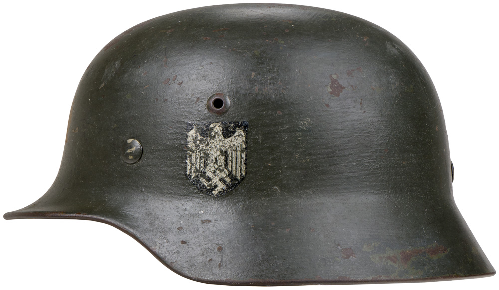 BACKGROUND: The first "modern" steel helmets were introduced by the French army in early 1915 and were shortly followed by the British army later that year. With plans on the drawing board, experimental helmets in the field, ("Gaede" helmet), and some captured French and British helmets the German army began tests for their own steel helmet at the Kummersdorf Proving Grounds in November, and in the field in December 1915. An acceptable pattern was developed and approved and production began at Eisen-und Hüttenwerke, AG Thale/Harz, in the spring of 1916. These first modern M16 helmets evolved into the M18 helmets by the end of WWI. The M16 and M18 helmets remained in usage through-out the Weimar Reichswehr era and on into the early years of the Third Reich until the development of the smaller, lighter M35 style helmet in June 1935. In an effort to reduced construction time and labor costs minor modifications were introduced in March 1940 resulting in the M40 helmet. Further construction modifications were undertaken in August 1942 resulting in the M42 helmet. Originally the Third Reich national tri-color helmet decal was introduced on March 14TH 1933 for wear on the left side of the helmet to replace the Reichswehr era state shield insignia. Regulations of February 17TH 1934 introduced the Wehrmacht eagle decal and the national tri-color decal was shifted to the right side of the helmet with the Wehrmacht eagle decal positioned on the left hand side. Regulations of March 21ST 1940 dictated that the national tri-color decal was to be removed from all helmets and further regulations of August 28TH 1943 abolished the Wehrmacht eagle decal and dictated that it was also to be removed from all helmets although the directives were not completely adhered to.
