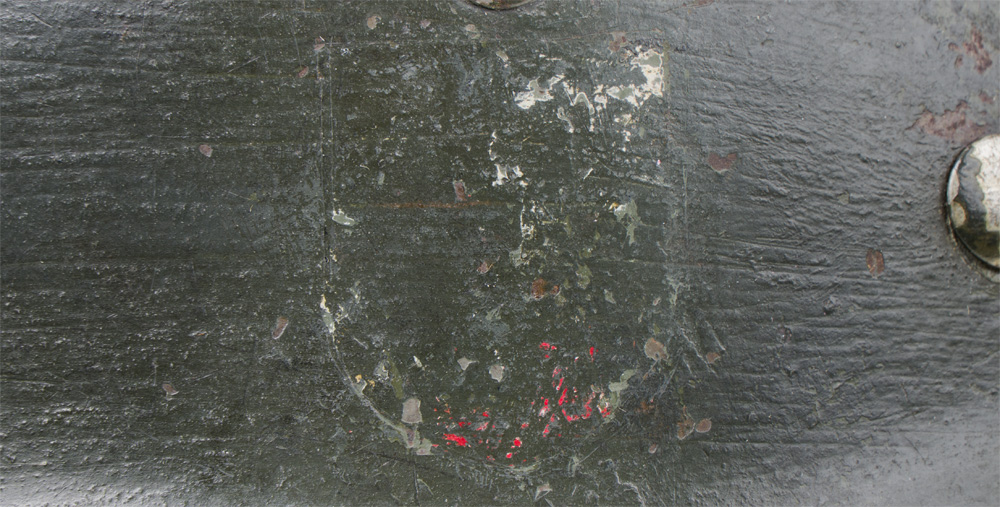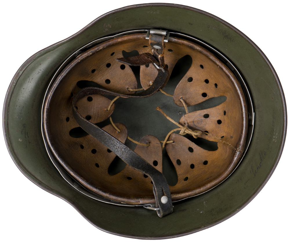 PHYSICAL DESCRIPTION: The stamped, sheet steel construction helmet most of its original feldgrau overpaint.