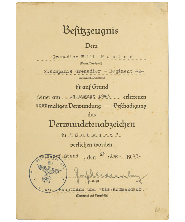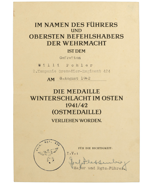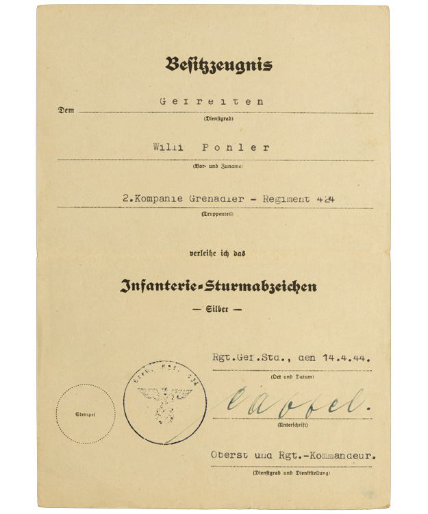 Fantastic grouping all to the same man! Close Combat in Bronze, Infantry Assault Badge Silver, EK2 (With envelope), Black & Silver Wound Badges, Russian Front Medal and two place ribbon badge. All with the original award documents plus photos of the original owner. Belonged to IR 424. Complete as photographed. Nice set!