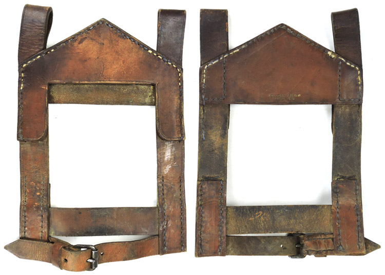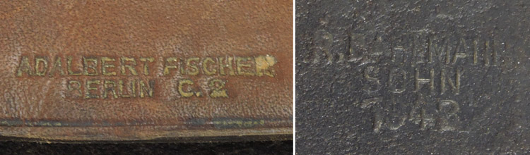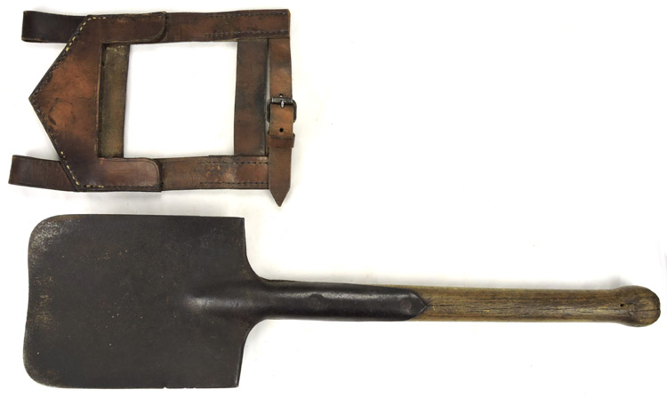 PHYSICAL DESCRIPTION: Early, non-folding pattern, entrenching tool consists of a lathed hardwood construction handle with an enlarged ball head for ease of handling and a slightly curved, tooled steel construction shovel head. The handle is secured to the shovel head by dual extended steel sleeves with two retaining rivets. The obverse extended sleeve is integral to the shovel head while the reverse sleeve is a separate triangular plate that is secured to the shovel head. Shovel is nicely maker marked and dated for 1942. Carrier is miss-matched and is for an earlier "pointed" shovel from either WW1 or 1920's vintage. Leather is Berlin maker marked.