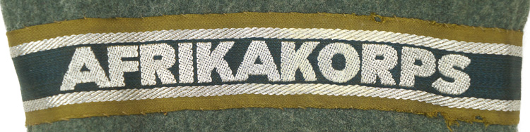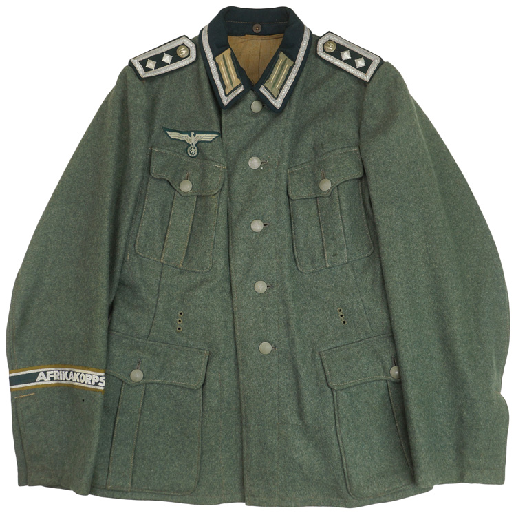 PHYSICAL DESCRIPTION: Field-grey wool/rayon blend construction field blouse features a vertical, five button front closure with a single metal hook and eye positioned at the neckline. The field blouse has four, pleated patch, front pockets with scalloped button down flaps. The field blouse has four sets of three, vertically aligned, stitched eyelets with one set situated at either side of the front closure panels and the other two to the reverse side panels. The eyelets were designed for the belt support hooks. The back panel has two vertical tapering darts and a short, central vertical tail skirt vent. The straight cut sleeve cuffs each have a vertical slash to the outside seam with dual fit adjustment buttons. The field blouse has a blue/green badge cloth, lay down collar with the typical zig-zag reinforcement stitching to the reverse. All original stitching to the collar tabs, breast eagle and Afrikakorps Ärmelstreiffen. Buttons look to be all original stitching and application. Awards loops for one breast badge and one ribbon bar. First pattern, slip on, pointed shoulder straps with no waffenfarbe. (Shoulder straps pre-date the cufftitle, so it should really have the later pattern straps added to be technically correct.) Blue/green badge cloth straps bordered on all sides in bright waffle patterned silver/aluminum tress. Each strap has two stamped aluminum rank pips. Very nice size and issue markings. Couple of minor moth holes. The field blouse is roughly size 34" chest. Superb tunic!
