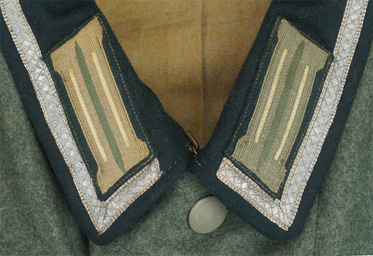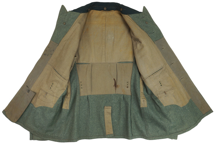 BACKGROUND: The development of the M36 field blouse can be traced back to April 1933 with the introduction of the first pattern field blouses which were a departure from the cut and style of tunics utilized in World War I. From its introduction until 1936 the field blouse underwent a couple of small modifications designed to enhance its performance, appearance and longevity. Modifications to the 1933 pattern field blouse began in December 1934 when the original field-grey basic cloth collar was altered to a field-grey badge cloth for a better appearance. In September 1935 the collar was altered again from the field-grey badge cloth to dark blue/green badge cloth. The final pre-war modification to the field blouse occurred in December 1936 with the addition of a partial lining to the interior breast and upper back panels to increase its wear-out time. Officers and certain senior NCO ranks were responsible for purchasing their own uniforms and as a result were allotted a clothing allowance through the army’s Kliederkasse, (Clothing Account), system. The Officers and certain senior NCO’s could choose to purchase their uniforms from the armed forces clothing depots or to privately purchase garments of higher quality. Although enlisted personnel were issued their uniforms from government supplies they were also permitted to purchase privately tailored uniforms although the price may have been restrictive.