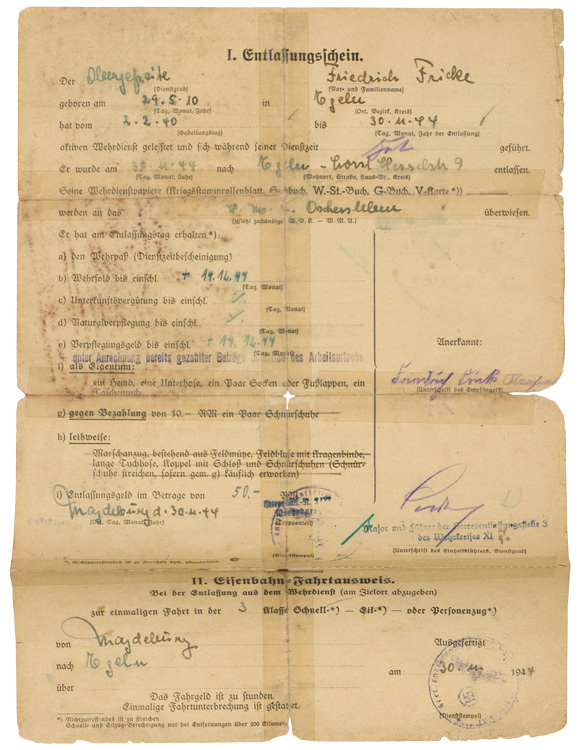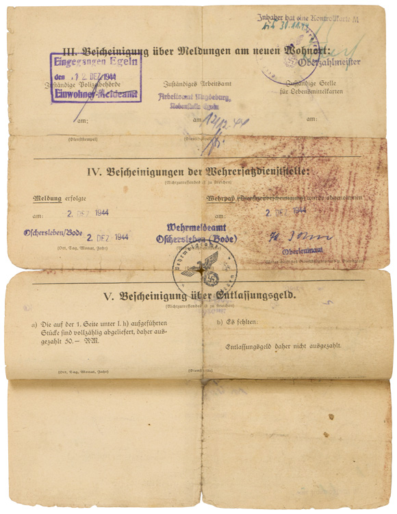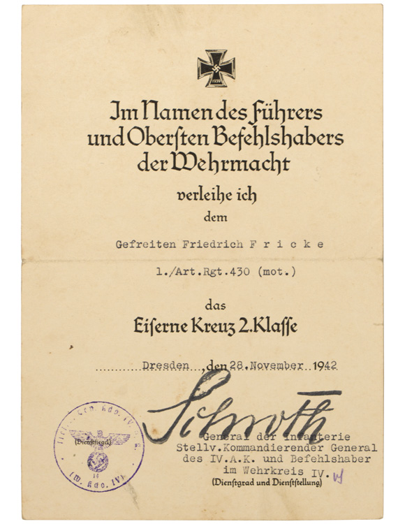 A named grouping belonging to a Corporal who served with Schw. Art. Abt. 430, Indepdent Army Unit who served in France and Russia. The unit wa attached to the 6. Army in Russia and surrendered in Stalingrad, but he was not with the unit at that time due to a severe wound from bomb shrapnel to his left leg on "26-6-42". He was medically discharged on "30-11-44". He was entitled to a Silver Wound Badge. Included are award documents for the Winter War Medal, Iron Cross 2nd Class, his discharge certificate and wehrpass (all entries are photographed).