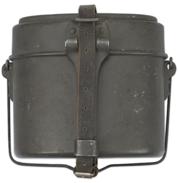 PHYSICAL DESCRIPTION: Standard issue, 1.7 liter capacity, field grey painted, kidney shaped, tooled, aluminum and steel construction mess kit. The kit has a removable top lid which serves double duty as a plate or frying pan. The removable top lid has a riveted on, hinged, fold back, steel handle with a raised lip to the bottom edge which secures the lid to the bottom of the mess kit body. Both the top and bottom edges of the hinged handle have raised, horizontal, strap retaining bars with central cut outs. Each side of the mess kit body has a small, riveted on, vertically oval, carrying handle mount with an extended, closed loop to secure the swivel, wire carrying/suspension handle. The wire carrying/suspension handle features a semi circular indentation to the top center allowing it to be suspended over a fire. Top is marked "RFI 39" and the bottom "RFI 39". Comes with a strap.