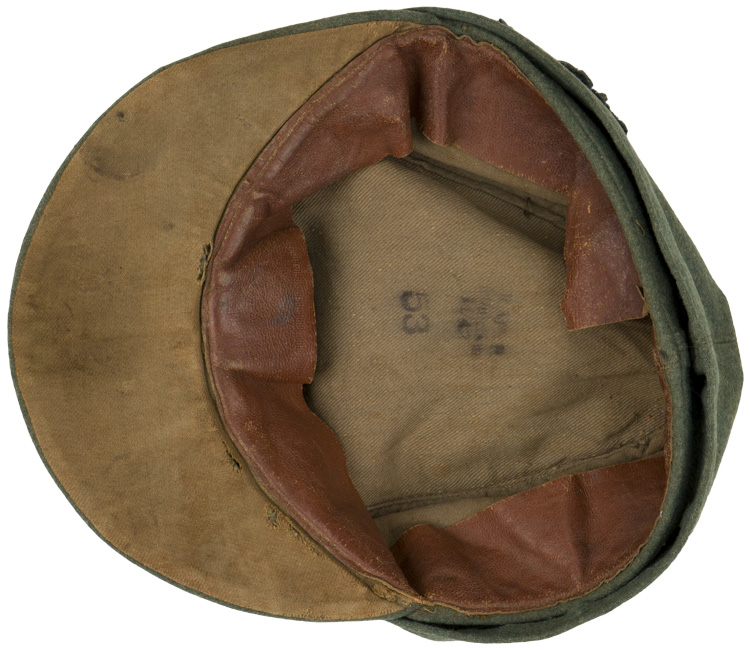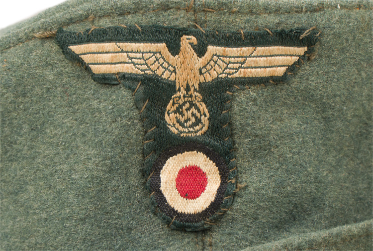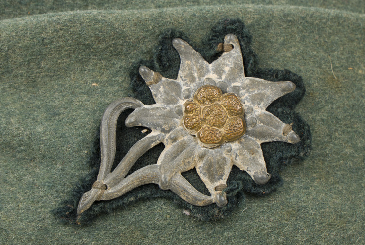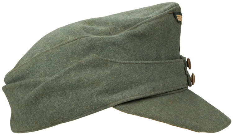 PHYSICAL DESCRIPTION: Field-grey, wool/rayon construction cap features fold down back and side panels with scalloped front edge and forward sides, held in the upward position at the front by two small mid-brown moulded bakelite buttons. Back and side panels were designed to be folded down to protect the wearers ears and neck and the scalloped front section could be secured with the buttons closed under the wearers chin. Buttons are ornamental, so the flap will not fold down (private purchase variant). Cap has a short cloth covered visor. Front center of cap features a machine woven, combined, national eagle in matte grey threads and national tri-color cockade on a woven green rayon, "T" shaped base. Insignia is handstitched to cap. Left side panel of cap has a 1939 pattern, silver washed, stamped alloy edelweiss with nine petals, two leaves, single stem and separate, gilt washed, stamen attached by two bent over prongs. Interior of cap is fully lined in light weight grey cotton/rayon. Size marked 53 with a faint makers mark. Original sweatband is present. Saw loads of period use and wear. Nice salty example.