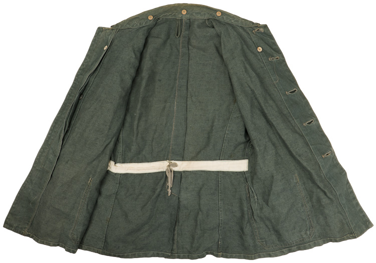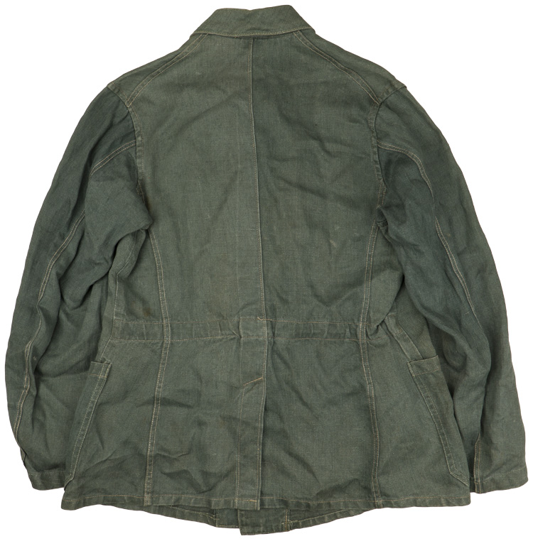 PHYSICAL DESCRIPTION: Mid-war, (circa 1942), reed green, cotton/rayon blend construction drill tunic with an HBT weave, features a vertical, five button front closure with a single metal hook and eye positioned at the neckline. The tunic has two, non-pleated hip pockets with straight edged button down flaps and no breast pockets. The reverse of the tunic has a short, central, vertical, tail skirt vent. The tunic has straight cut, non-adjustable sleeves. The tunic has no insignia, or any evidence that any was ever applied, as per regulations. The unlined interior of the tunic has horizontal, tunnel looped, fit adjustment drawstrings positioned at the reverse waistline. The front closure and exterior pocket buttons are all the removable, field-grey painted, pebbled alloy type secured by circular "S" rings. The collar liner buttons are the ersatz, tan, pressed cardboard type and appear to have their original stitching. The tunic is roughly size 36" chest.