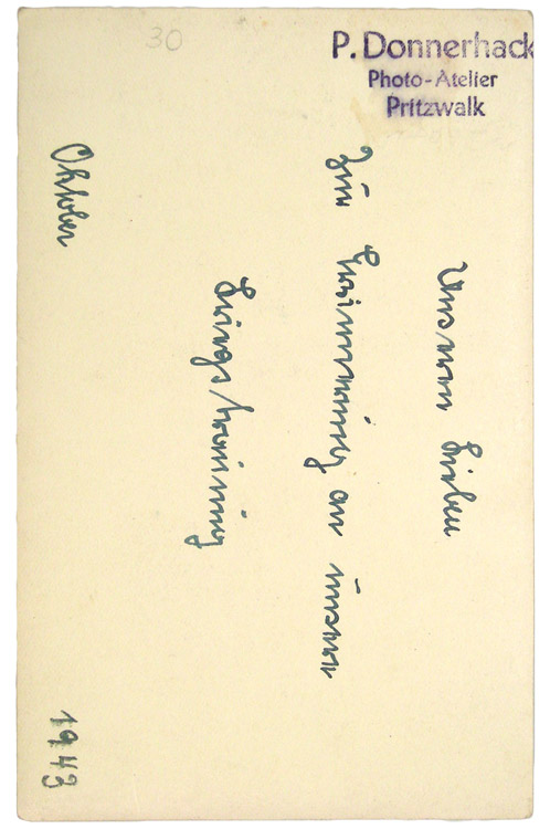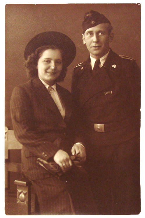 PHYSICAL DESCRIPTION: Roughly, 9cm x 14cm mid-weight black and white photograph. A panzer NCO in full uniform with his wife or girlfriend. Hand written note to the reverse and dated for 1943.