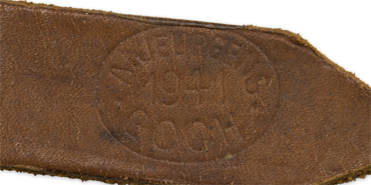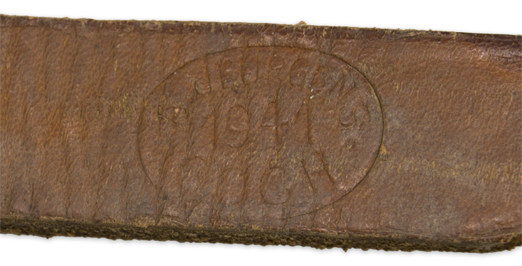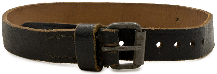 PHYSICAL DESCRIPTION: Three, roughly, 54cm long, 18mm wide, blackened leather construction straps with a steel, pronged, roller buckle and leather retaining loop to one end and corresponding buckling holes to the other end. One has an extra tiny hole punched into the leather. All are maker marked and dated for 1941.