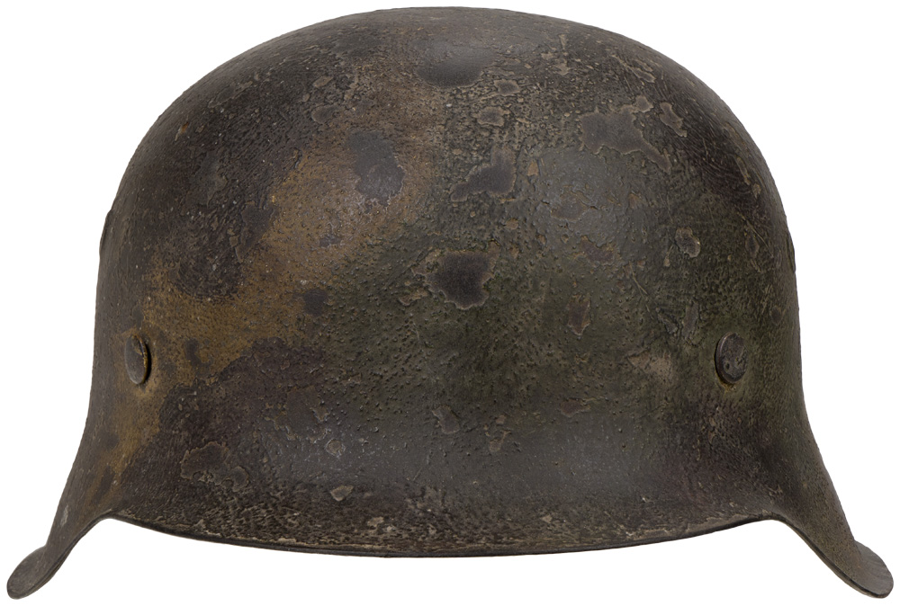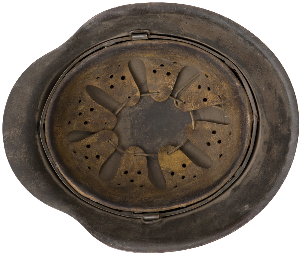 PHYSICAL DESCRIPTION: The stamped, sheet steel construction helmet retains a good portion of its original rough textured, hand brushed, age and usage darkened, camo overpaint. All three liner retaining rivets are intact. elmet has its original untouched M31 pigskin leather liner with all eight fingers and the original tie string intact. The interior, reverse, neck guard apron has a stamped serial/lot number that appears to be, "?338", and the manufacturer’s code and size that appears to be, "NS66" indicating manufacture by Vereinigte Deutsche Nickelwerke, AG. Schwerte, size 66.