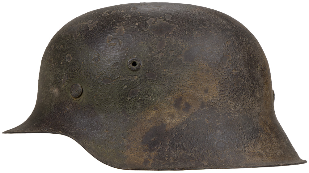 BACKGROUND: The first "modern" steel helmets were introduced by the French army in early 1915 and were shortly followed by the British army later that year. With plans on the drawing board, experimental helmets in the field, ("Gaede" helmet), and some captured French and British helmets the German army began tests for their own steel helmet at the Kummersdorf Proving Grounds in November, and in the field in December 1915. An acceptable pattern was developed and approved and production began at Eisen-und Hüttenwerke, AG Thale/Harz, in the spring of 1916. These first modern M16 helmets evolved into the M18 helmets by the end of WWI. The M16 and M18 helmets remained in usage through-out the Weimar Reichswehr era and on into the early years of the Third Reich until the development of the smaller, lighter M35 style helmet in June 1935. In an effort to reduced construction time and labor costs minor modifications were introduced in March 1940 resulting in the M40 helmet. Further construction modifications were undertaken in August 1942 resulting in the M42 helmet. Originally the Third Reich national tri-color helmet decal was introduced on March 14TH 1933 for wear on the left side of the helmet to replace the Reichswehr era state shield insignia. Regulations of February 17TH 1934 introduced the Wehrmacht eagle decal and the national tri-color decal was shifted to the right side of the helmet with the Wehrmacht eagle decal positioned on the left hand side. Regulations of March 21ST 1940 dictated that the national tri-color decal was to be removed from all helmets and further regulations of August 28TH 1943 abolished the Wehrmacht eagle decal and dictated that it was also to be removed from all helmets although the directives were not completely adhered to.