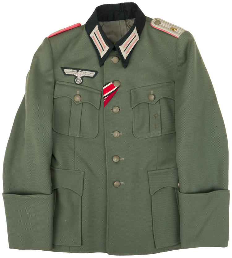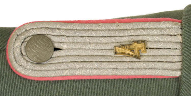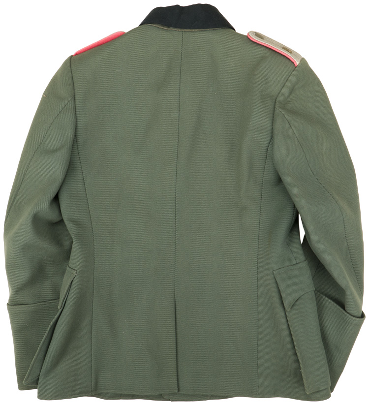 BACKGROUND: The development of the M36 field blouse can be traced back to April 1933 with the introduction of the first pattern field blouses which were a departure from the cut and style of tunics utilized in World War I. From its introduction until 1936 the field blouse underwent a couple of small modifications designed to enhance its performance, appearance and longevity. Modifications to the 1933 pattern field blouse began in December 1934 when the original field-grey basic cloth collar was altered to a field-grey badge cloth for a better appearance. In September 1935 the collar was altered again from the field-grey badge cloth to dark blue/green badge cloth. The final pre-war modification to the field blouse occurred in December 1936 with the addition of a partial lining to the interior breast and upper back panels to increase its wear-out time. Officers and certain senior NCO ranks were responsible for purchasing their own uniforms and as a result were allotted a clothing allowance through the army’s Kleiderkasse, (Clothing Account), system. The Officers and certain senior NCO’s could choose to purchase their uniforms from the armed forces clothing depots or to privately purchase garments of higher quality. Although enlisted personnel were issued their uniforms from government supplies they were also permitted to purchase privately tailored uniforms although the price may have been restrictive. On the field blouse and service tunic the waffenfarbe was generally displayed on the shoulder straps/boards and the collar tabs.