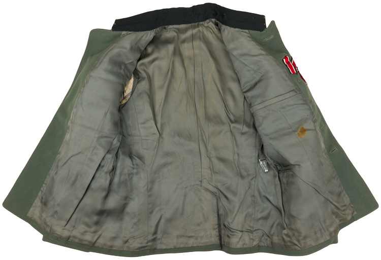 PHYSICAL DESCRIPTION: Nice quality, private purchase, field-grey wool/rayon blend construction tunic. The tunic features a vertical, six button front closure with dual metal hooks and eyes at the neck. The tunic has four, pleated, front pockets with scalloped button down flaps. Collar tabs, shoulder boards (4th Rgt) and breast eagle all look to be original period application. Buttons all look to be original stitching. Award loop for one badge (top loop broken and will need to be fixed). The interior of the tunic is fully lined in grey/green rayon with off-white striped sleeves. The tunic is roughly a size 34" chest. Nice clean tunic.