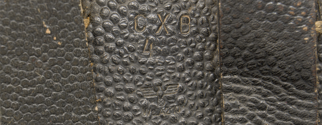 PHYSICAL DESCRIPTION: Second pattern, molded, blackened pebbled, leather construction, P38 "softshell" holster. The holster features a fold over top flap with a horizontal stitched hinge to the reverse and a stitched on vertical leather closure strap to the obverse. The top flap closure strap attaches to a natural steel stud that is situated on a fold back panel to the left hand side of the holster body. The holster body also has a stitched on, spare magazine pocket to the right front. The reverse of the holster has two slightly diagonally angled stitched on leather belt loops. The reverse of the holster is well marked with impressed designation, "P38", a Waffen-amt stamp and the manufacturers three letter code "cxb".