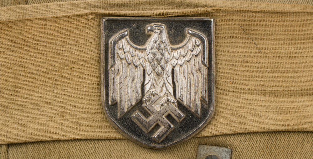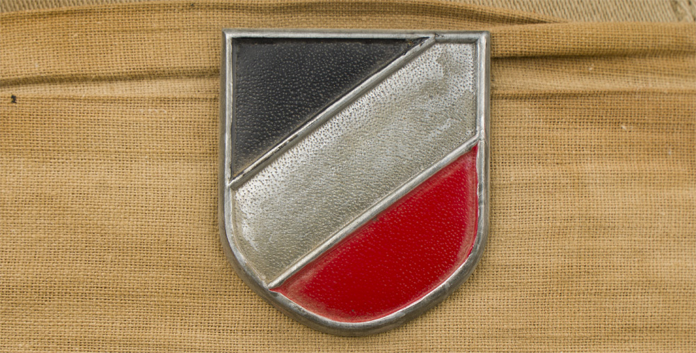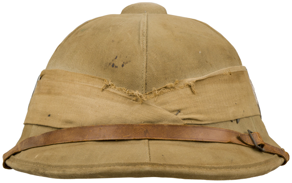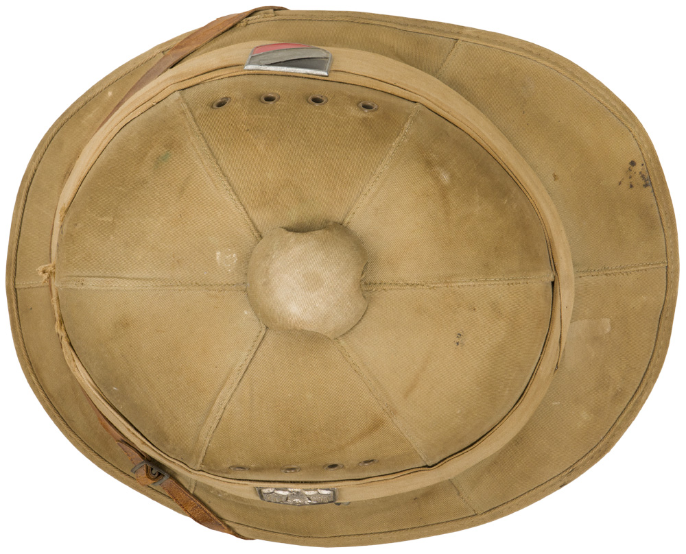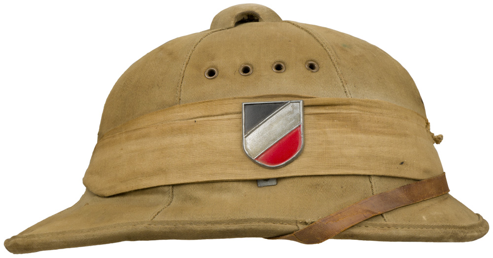 BACKGROUND: In late 1940, with the impending German entrance into the North African campaign, tropical uniforms, headgear and equipment were quickly developed and issued in time for DAK, Deutsches Afrika Korps, (German Africa Corps), personnel’s arrival in Tripoli in February 1941. One of the new headgear items introduced was the tropical pith helmet which was based on the design of the earlier Kriegsmarine pith helmet. On its introduction the pith helmet was constructed of a formed cork base with a cotton twill covering until a second pattern pith helmet was introduced with a formed cork base with a felt covering. The second pattern pith helmet followed the same basic design as the first pattern but was modified to ease production time and material costs. Wear of the pith helmets was extended to personnel serving in southern areas of continental Europe but the helmets proved ineffective and unpopular and manufacture was discontinued sometime in 1942. On introduction the tropical pith helmets were outfitted with a national eagle and national tri-color identification shields.