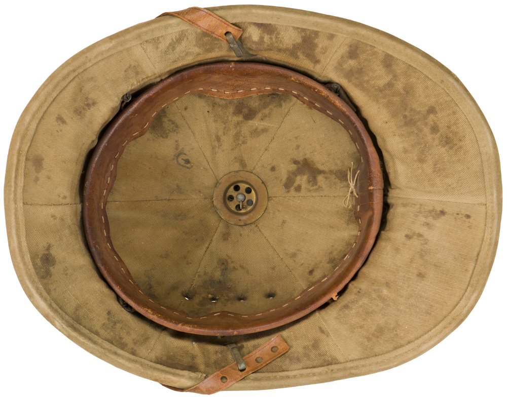 PHYSICAL DESCRIPTION: Rare WW2 German Afrika Korps captured South African Pith Helmet. The helmet body is made of compressed and shaped cork covered by khaki cotton fabric. A wide Pugaree of khaki muslin fabric surrounds the lower dome of the helmet with Afrika Korps pith helmet shields applied in North Afrika, as seen in the reference book. There are four grommeted vent holes on each side to allow air to circulate above the wearer’s head. A leather sweatband is affixed to posts inside the liner, and the original brown leather chinstrap is attached to brass mounting bales inside and worn over the front brim of the helmet as seen in the book and period photos. This example is heavily worn, with staining and fabric damage consistent with its age and usage, but the cork body is not damaged or misshapen. Overall a fine example of a rare Afrika Korps worn pith helmet. Approximately size 54.