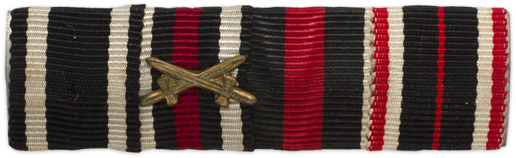 PHYSICAL DESCRIPTION: Four place ribbon bar consists of a 1914 EK2,1914-18 Cross of Honor, Commemorative Medal of 1st October 1938 and War Merit Medal. Complete with pin back device.