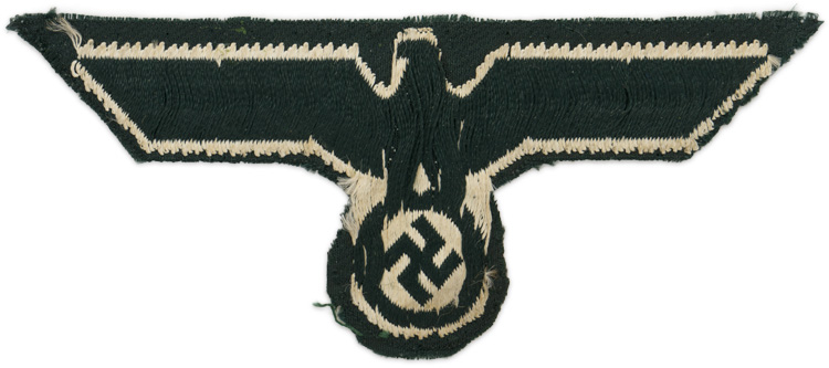 BACKGROUND: The German army originally adopted a slightly modified version of the NSDAP’s national eagle by order on February 17TH 1934, with instructions to have it applied to all steel helmets, visor caps, and tunics by May 1ST 1934. Later amendments to the introductory order stipulated that the national eagle was also to be worn on all field caps, the sports uniform and the black panzer wrap. The eagle came in three distinct designs with two having slightly different out-stretched wings and the third with down-swept wings. Generally officer’s ranks utilized hand or machine embroidered breast eagles while EM/NCO’s ranks utilized machine embroidered or woven breast eagles. The early standard issue EM/NCO’s M36 breast eagles were in white threads and were to be abolished in 1939 to be replaced with a less visible grey M39 breast eagle but the changeover was never fully completed.