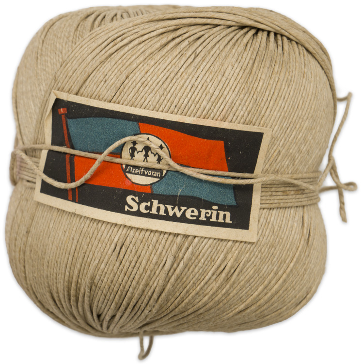 A 8.5cm diameter x 8cm tall spool of white twine/cord with original paper tag attached.