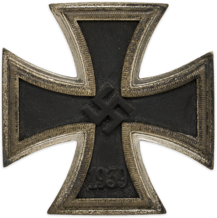 PHYSICAL DESCRIPTION: 1939 pattern, private purchase, die struck, three piece, iron and nickel/silver plated alloy construction Pattée style cross with a single piece iron core and a two piece alloy frame. The obverse of the award features an embossed, central, canted, swastika with the re-institution date, "1939", to the bottom arm. The swastika stands out in nice, high relief while the date is somewhat lower. The plain reverse has a solid, soldered, block type hinge, a broad, tapering vertical pin and a catch all intact. The reverse of the pin is well marked with impressed manufacturer’s LDO code, "L/52", within a rectangular recess indicating manufacture by C. F. Zimmermann of Pforzheim. Scarce to find with the single "L" marking, most are double marked.