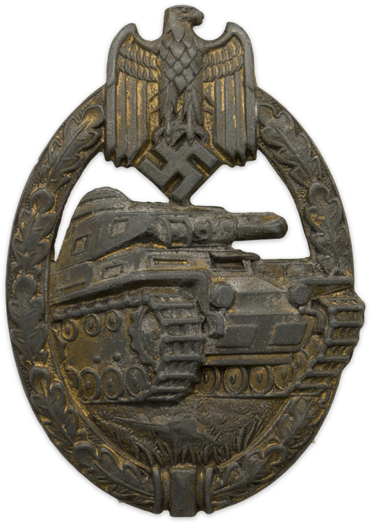 PHYSICAL DESCRIPTION: Nicely detailed, die stamped, hollow backed, alloy award with a bronze washed finish is in the form of an embossed, vertically oval, oak-leaf wreath with a Wehrmacht style eagle with down-swept wings, clutching a canted swastika in it’s talons, superimposed to the top center, encompassing the cut-out, forward profile of a tank. The wreath, eagle and tank all show nice detailing. The bronze wash is retained about 90% with small spots of wear to the base tombac alloy. The reverse of the badge is a mirror image of the obverse. The reverse has a solid, soldered hinge, a thin, round, vertical pin and a soldered catch all intact. The badge has no visible manufacturer’s markings but is a rare CE Juncker example.