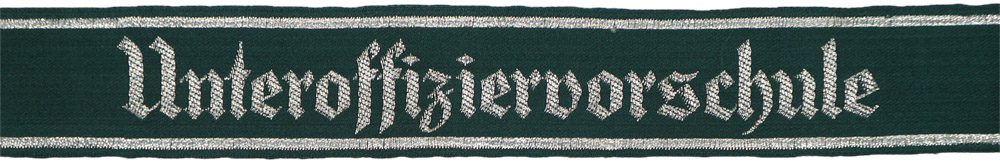 PHYSICAL DESCRIPTION: Green rayon construction cufftitle with machine woven, Gothic style script, "Unteroffiziervorschule", in bright, silver/aluminum, flat-wire threads. The cufftitle is bordered at both the top and bottom edges in vertically woven, bright, silver/aluminum flat-wire threads. The reverse of the cufftitle has loosely woven, vertical, silver/aluminum flat-wire threads and shows the script in a green rayon mirror image.
