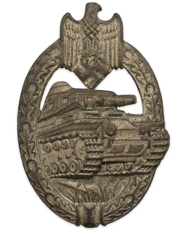 PHYSICAL DESCRIPTION: Nicely detailed, die struck alloy, partially scooped backed, badge with a polished silver washed finish. The badge is in the form of an embossed, vertically oval, oak-leaf wreath with a Wehrmacht style eagle with down-swept wings, superimposed to the top center, encompassing the forward profile of a tank. The polished silver finish is retained about 80% and is still fairly bright. The reverse of the badge has scooped depressions to the tank barrel and body. The reverse has a soldered ball hinge inset into a circular recess with raised retaining lips, a thin round vertical pin, and a soldered catch on an inset circular base plate all intact. The reverse is well marked with embossed, stylized, overlapping manufacturer's initials within a triangular border, "AS", indicating manufacture by Adolf Scholze. Complete with original issue box and tissue paper!