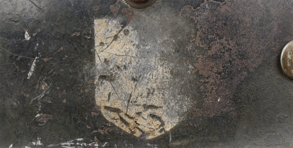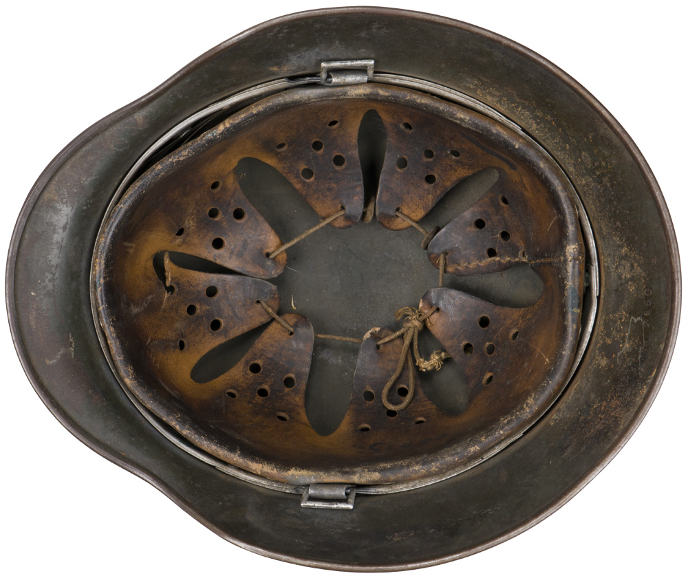 PHYSICAL DESCRIPTION: The stamped, sheet steel construction helmet retains a good portion of its original smooth feldgrau paint. Both decals are now mostly worn off. The interior of the helmet has a M31 leather liner with all eight of its fingers intact. The liner’s drawstring is present. The interior reverse neck guard apron is serial/lot number stamped, "3660", and the interior left side apron is stamped with the manufacturers code and size "EF64" indicating manufacture by Emaillierwerk, AG Fulda, size 64. Nice combat worn worn and used example.