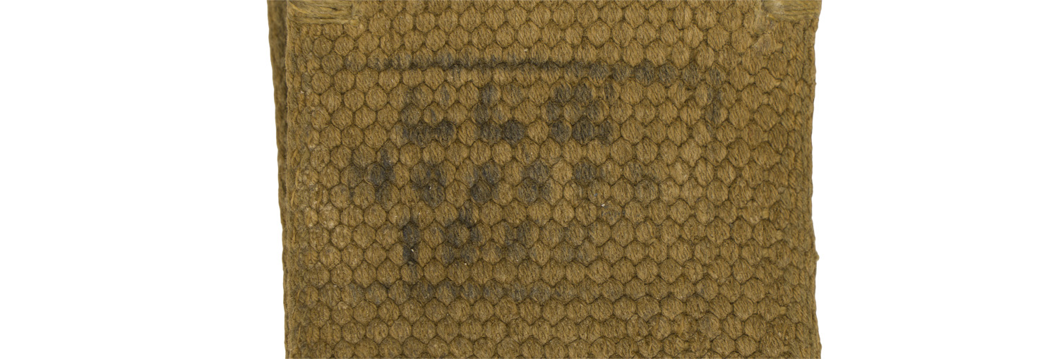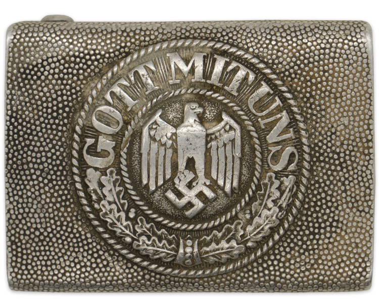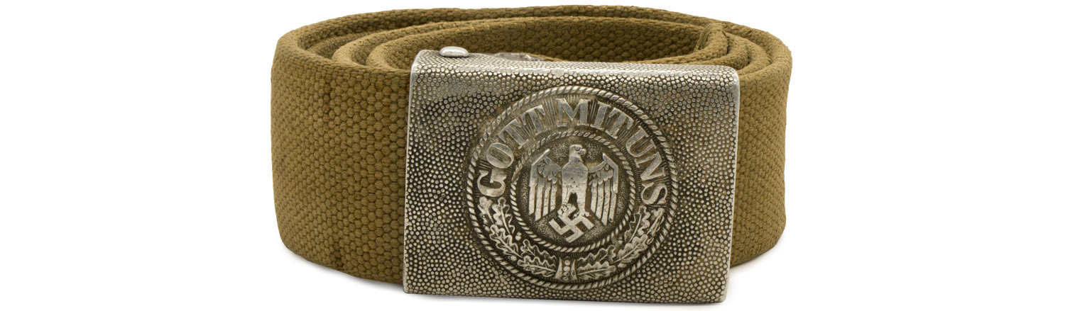PHYSICAL DESCRIPTION: Early, (circa 1936-1940), injection molded construction, natural aluminum box buckle with a pebbled background field and a slightly domed, embossed central motif. The central motif features an embossed Wehrmacht style eagle with down swept wings on a subtly pebbled field to the center, encompassed by an embossed oak-leaf cluster to the bottom and script, "Gott Mit Uns", (God with Us), to the top. The oak-leaf cluster and script are on a ribbed background field and are encircled by both an inner and outer simulated twisted rope border. The reverse has the integral, raised, slotted buckle catch and separate prong bar and prongs all intact. The buckle comes complete with a roughly, 45mm wide, 90cm, long, woven, khaki/olive canvas web construction waist belt with an olive drab painted, steel buckle catch and a web retaining tongue both intact. The buckle catch end of the belt is folded over and machine stitched to the reverse to secure the catch in place. The canvas tongue has it’s original stitching and seven pair of parallel, length adjustment buckling eyelets.