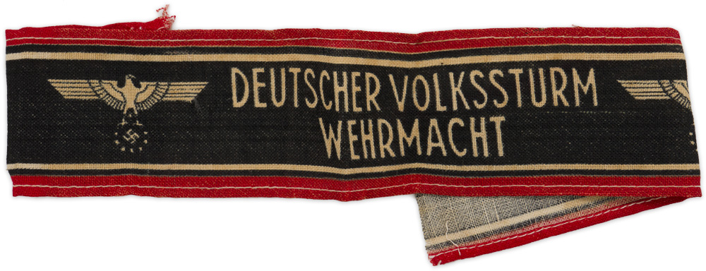 PHYSICAL DESCRIPTION: Official pattern armband with a multi-colored, printed design featuring horizontal, red bordered, top and bottom edges and a black/white/black center stripe. The armband has white printed Latin script, "Deutscher Volkssturm Wehrmacht", (German People’s Militia Armed Forces), in two lines, to the front center which is flanked by a white national eagle, with out-stretched wings, clutching a wreathed, canted, swastika to either side.