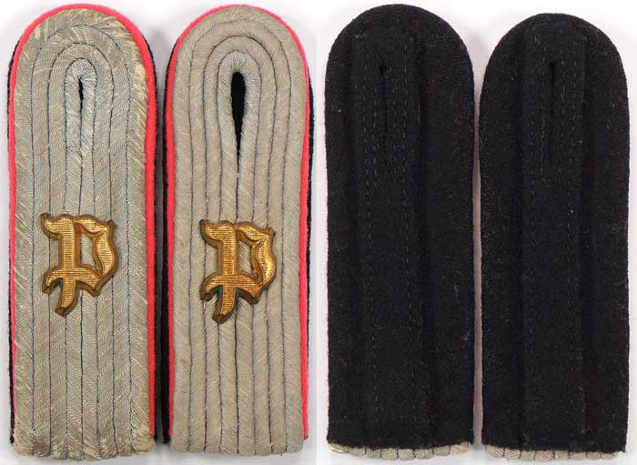 PHYSICAL DESCRIPTION: Slip on shoulder boards of matt silver/aluminum Russian braid, with pink wool waffenfarbe on a black wool base. Fire gilt, metal "P" cyphers to each. The shoulder boards represent the rank of SS-Untersturmführer serving in an Panzer unit. Excellent condition.