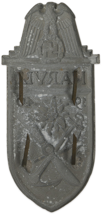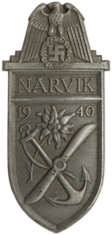 PHYSICAL DESCRIPTION: Die stamped, zinc construction with a gilt wash, shield featuring an embossed, stylized, national eagle with down-swept wings, clutching a wreathed, static swastika in its talons, to the top center, positioned above the embossed script, "Narvik 1940", an edelweiss flower and a crossed propeller and anchor. The edelweiss, propeller and anchor represent the Heer Gebirgsjäger, (Army Mountain troops), the Kriegsmarine and the Luftwaffe respectively, that participated in the victory at Narvik. All original prongs are intact. Late-war Deumer Type 2 production.