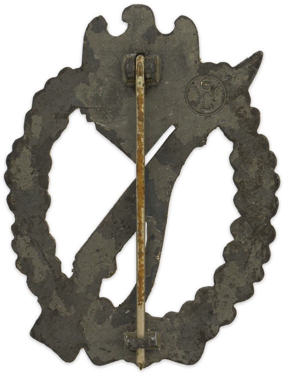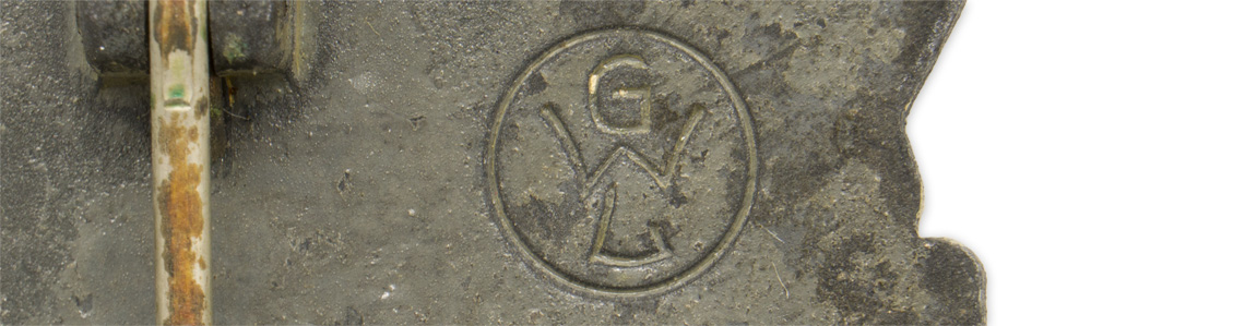 PHYSICAL DESCRIPTION: Injection molded, zinc construction, solid backed, badge with a silver wash features an embossed, vertically oval, oak-leaf wreath with a Wehrmacht style eagle with down-swept wings, clutching a canted swastika in its talons, superimposed to the top center, encompassing a cut-out, bolt action, rifle with a fixed bayonet and a sling. The solid reverse has an integral, molded, hinge, a thin, round, vertical, pin and an integral catch all intact. The reverse of the badge is well marked with the stamped, somewhat stylized, manufacturer’s initials within a circular border, "GWL", indicating manufacture by Gebrüder Wegerhof of Lüdenscheid.