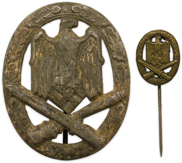 PHYSICAL DESCRIPTION: Die struck, hollow backed, alloy construction award. The nicely detailed badge features a cut-out, high relief Wehrmacht styled eagle with down-swept wings positioned above a crossed bayonet and stick grenade, and encompassed by an embossed, vertically oval, oak-leaf wreath. Complete pin and catch assembly. Unmarked. Comes with an original 18mm miniature version.