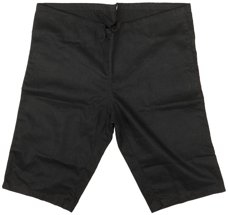 PHYSICAL DESCRIPTION: Ribbed, woven black cotton/tricot construction sports shorts feature a tunnel looped, black cotton, fit adjustment drawstring with an HBT, (Herring Bone Twill), weave to the waistband and dual-ply hemmed legs. Single rear pocket with button. Size marked 74 (cm). Nice clean condition.