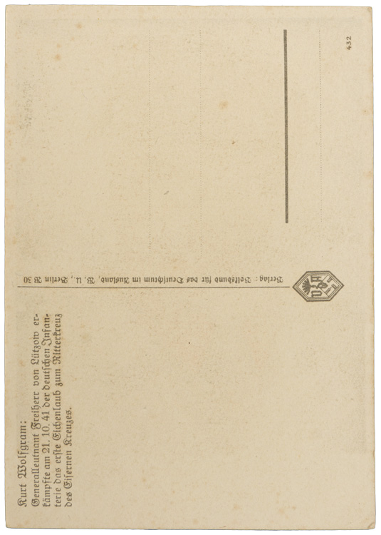 PHYSICAL DESCRIPTION: Roughly, 10.5cm x 15cm light-weight cardstock, colour artwork postcard features a close up of Knight’s Cross of the Iron Cross and Oak-Leaves, Generalleutnant Freiherr von Lützow. The reverse of the unused postcard has black printed script that includes, "Verlag: Volksbund für das Deutschtum im Ausland", Publisher: (National League for Germans Abroad). The postcard was produced by the VDA,. The artist was Kurt Worfgram.
