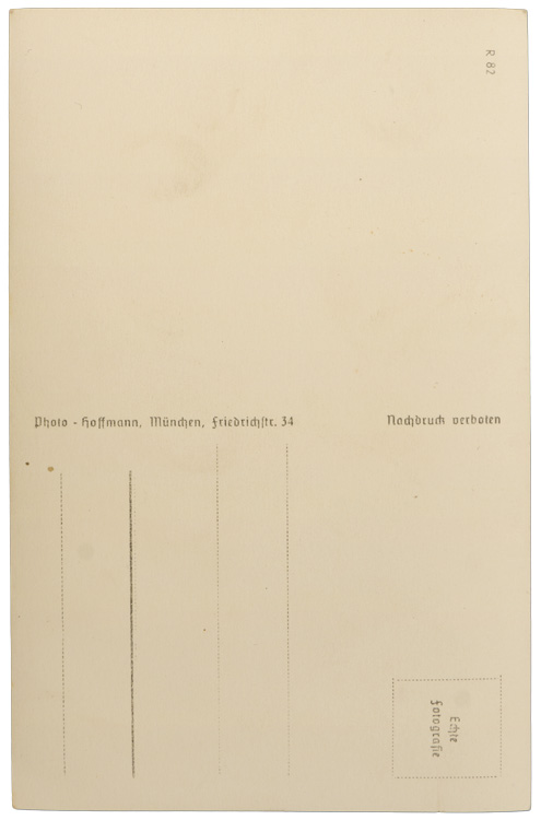 A standard size, black and white portrait photograph postcard that has not been posted or used. Portrait photograph taken by Hoffmann.