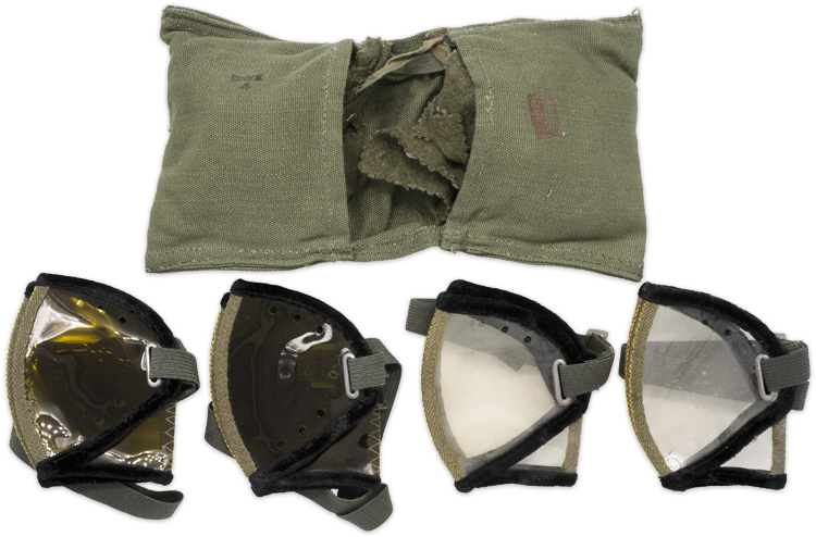 PHYSICAL DESCRIPTION: The set of four goggles consist of foldable, clear, plastic lenses which are held together by three, machine stitched, vertical, ribbed, field-grey cotton/rayon strips. Each lens consists of a front and side panel joined by one of the vertical cotton/rayon strips with the third vertical strip situated at the bridge of the nose. The outer edges of the lenses are trimmed with a black velvet "frame", for comfort. The side lens panels each have a small vertical slash for securing the headband. The headband consists of two, horizontal ribbed, grey elastic strips with a small metal joining clip and a grey rayon strip with an HBT (Herring Bone Twill), weave to the reverse center. The headband also has a small sliding, metal, length adjustment buckle. Comes with their original folding cloth storage case.