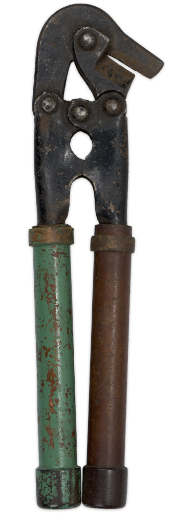PHYSICAL DESCRIPTION: Roughly, 39cm tall, tooled steel and sheet metal construction wire cutters with bakelite grips (one painted green). The wire cutters consist of dual, tubular, sheet metal handles fitted with mottled tan bakelite grips with additional raised mottled brown bakelite end pieces to prevent slippage. The tubular sheet metal handles have a central swivel hinge and an additional two swivel hinges which secure them to the cutting head. The uniquely shaped, curved angle cutting head has an additional swivel hinge with dual, downwardly angled cutting blades. Blades are very worn from decades of use. Comes with a excellent original case.