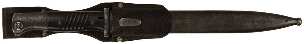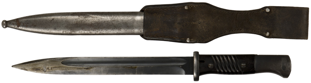 BACKGROUND: The K98 bayonet was a modification of the already modified S84/98 bayonet that had been originally developed in 1915. Manufacture of this new modified bayonet began in 1934 with mass production beginning in 1936. The K98 bayonet was a standard issue item and was accompanied by a bayonet frog to be worn on the reverse left side of the weight bearing waist belt. The K98 bayonet remained the standard issue bayonet through-out the war with minor manufacturing variations. As the war continued the quality of the bayonets deteriorated and in mid-1944 most manufacturers discontinued producing the bayonet to concentrate on producing other essential war materials.