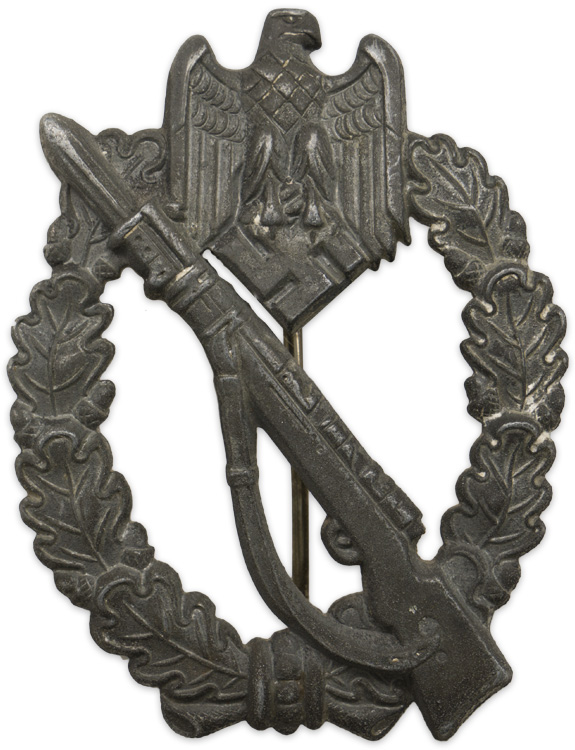 PHYSICAL DESCRIPTION: Die struck, solid backed, zinc award. The nicely detailed badge features an embossed, vertically oval, oak-leaf wreath with a Wehrmacht style eagle with down-swept wings, superimposed to the top center, encompassing a cut-out rifle with fixed bayonet and sling. Complete with original hinge, pin and catch assembly.