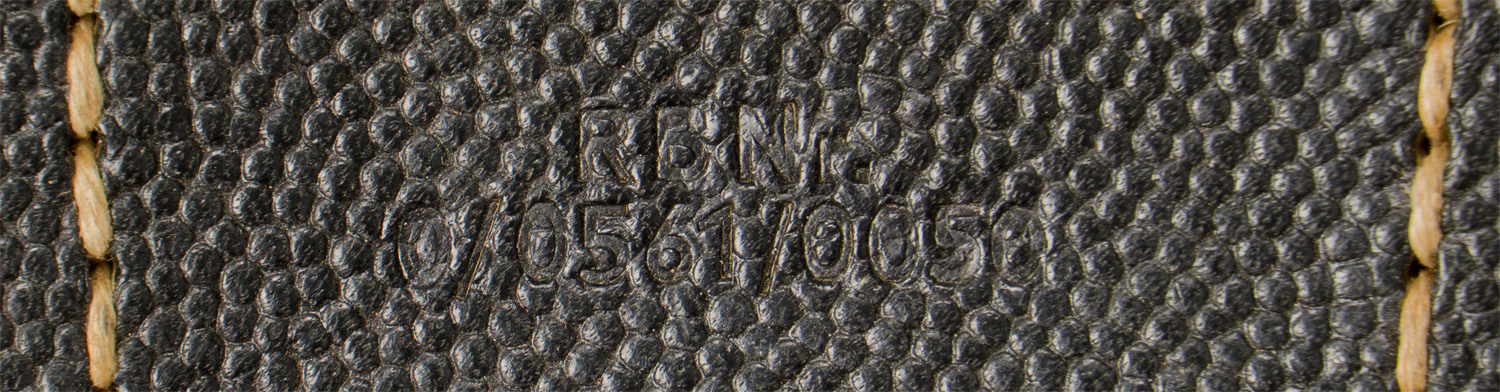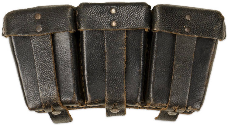 PHYSICAL DESCRIPTION: Later pattern, blackened pebbled leather construction, three compartment ammo pouch. Separator strips are complete. Rbnr# marked. Nice!