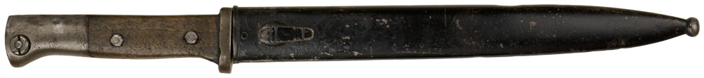 BACKGROUND: The K98 bayonet was a modification of the already modified S84/98 bayonet that had been originally developed in 1915. Manufacture of this new modified bayonet began in 1934 with mass production beginning in 1936. The K98 bayonet was a standard issue item and was accompanied by a bayonet frog to be worn on the reverse left side of the weight bearing waist belt. The K98 bayonet remained the standard issue bayonet through-out the war with minor manufacturing variations. As the war continued the quality of the bayonets deteriorated and in mid-1944 most manufacturers discontinued producing the bayonet to concentrate on producing other essential war materials.