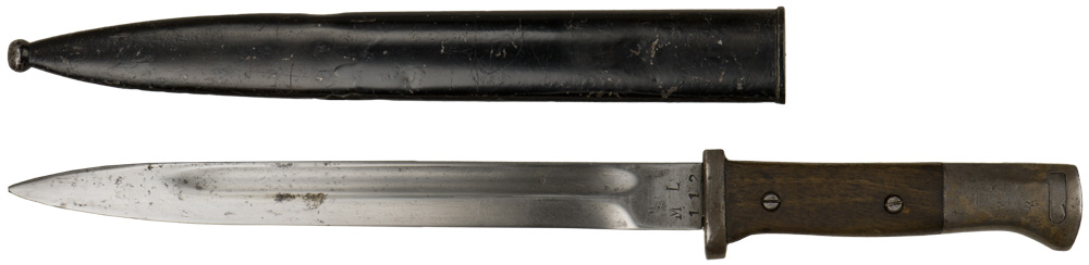 PHYSICAL DESCRIPTION: Roughly 25cm long, drop forged, steel construction blade with wide fullers. Blade retains most it's original bluing. Marked "ML" "112". Stud functions well. The painted scabbard is marked to the throat with a faint number.